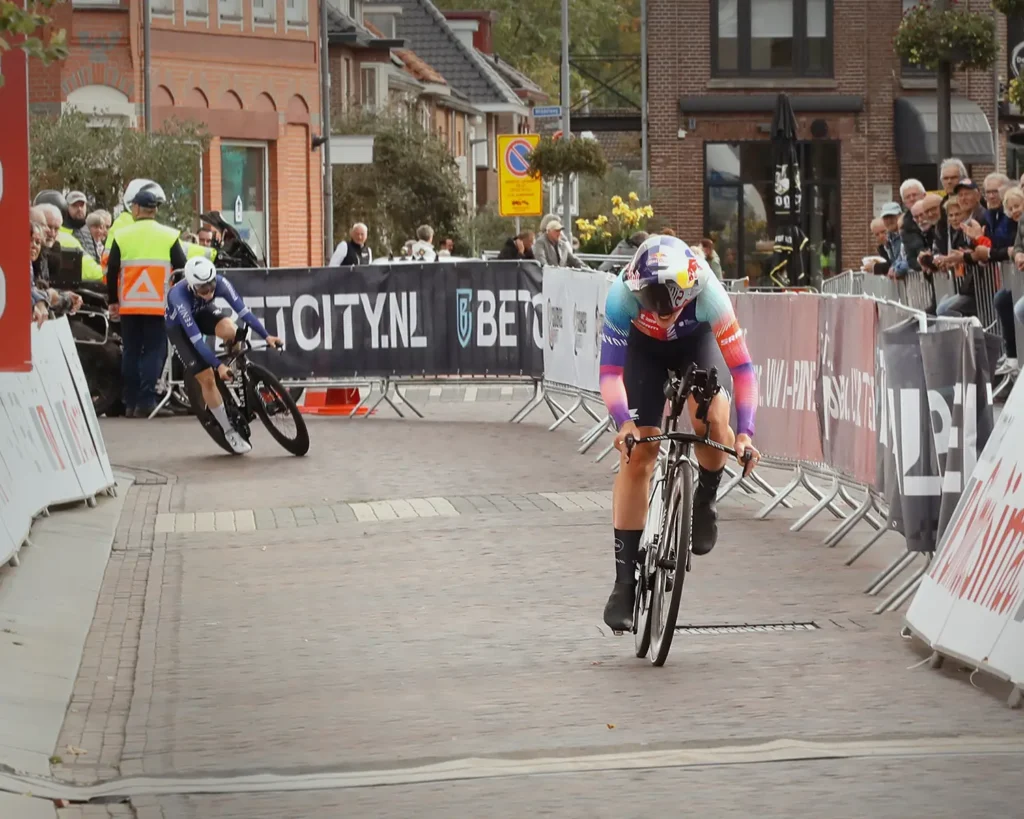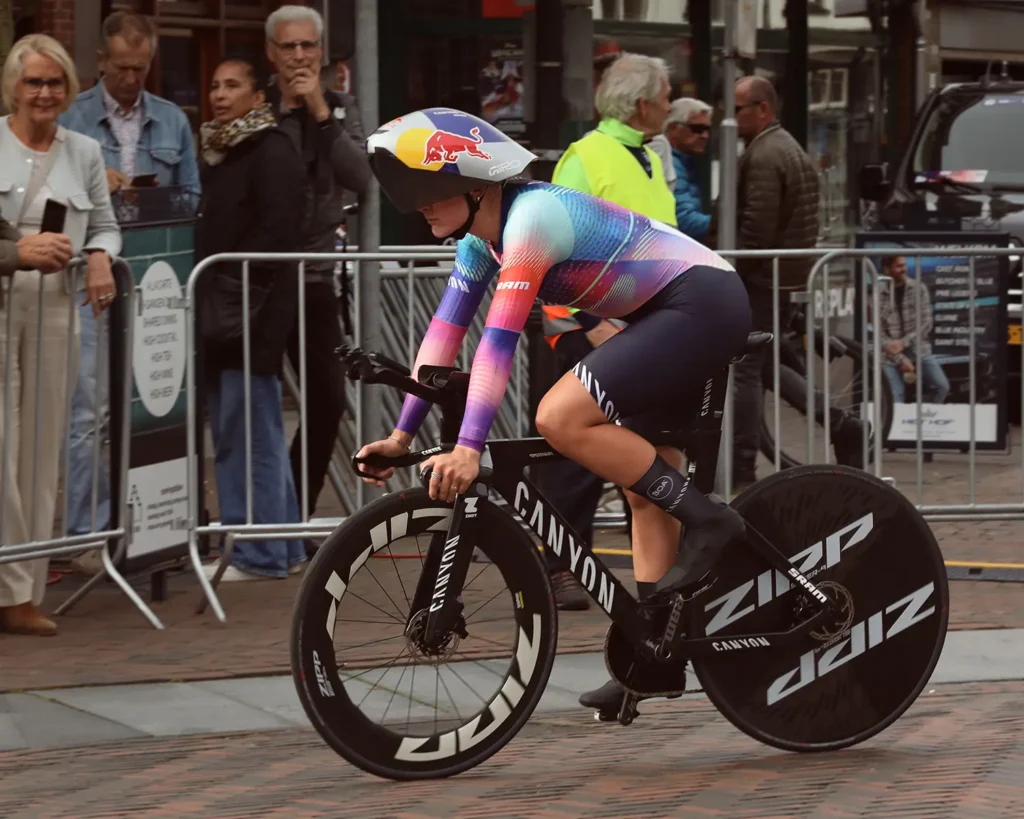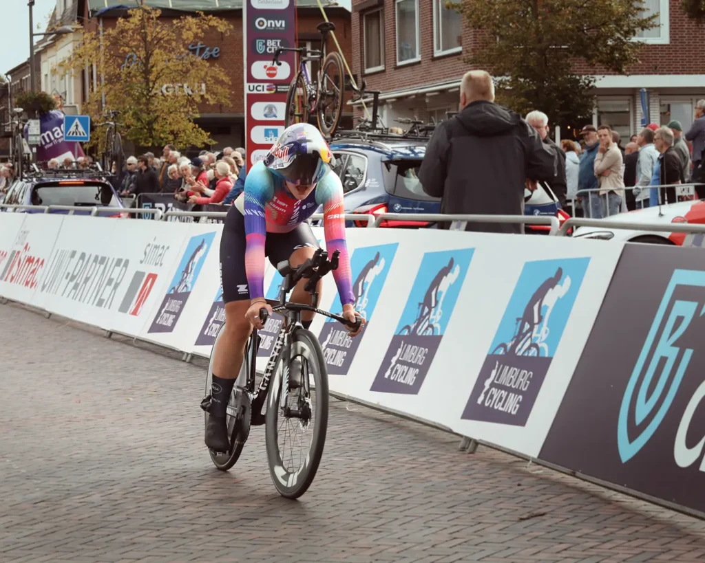 The weather that day was beautiful autumn sunshine, with temperatures close to 18 degrees Celsius and a moderate wind – nearly perfect conditions for a time trial. Teniel Campbell (Liv AlUla Jayco) set an early fast time of 13:19, with an average speed of 45.483 km/h. However, she barely had time to sit in the ‘hot seat’ before Lieke Nooijen (Visma – Lease a Bike) shattered her time by over half a minute. She clocked in at 12:47 with an average speed of 47.349 km/h. Ellen van Dijk and Riejanne Markus, among others, made strong attempts but couldn’t beat Nooijen’s time.